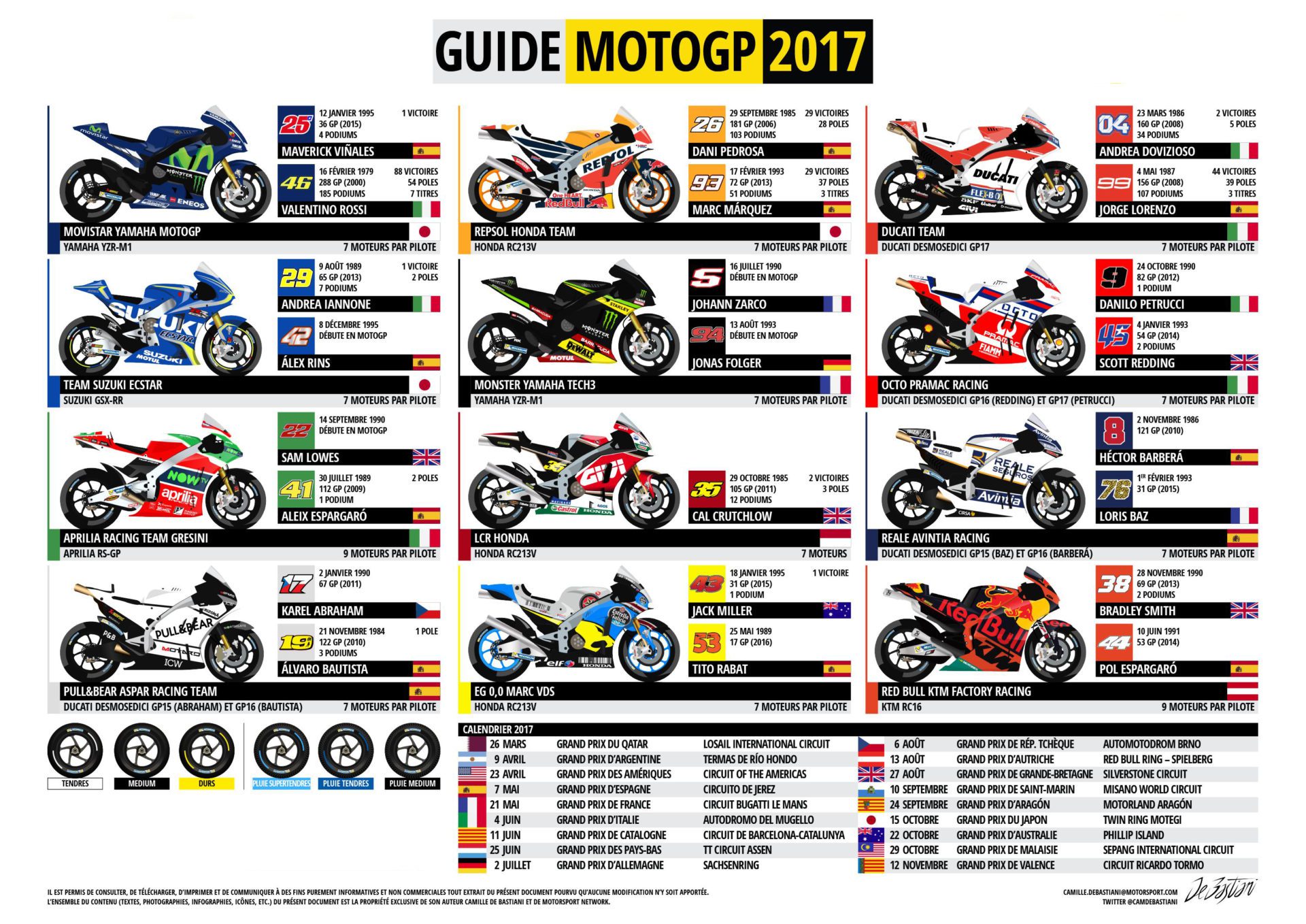 Voilà un récapitulatif des pilotes de leurs écuries et le calendrier du GP 2017 :
