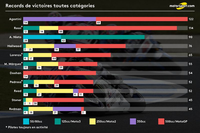 Marc Marquez #93, l’espagnol, ses performances et sa constance lui ont permis d’aller chercher les podiums et d’être le détenteur de 3 titres en MotoGP. Il ne compte pas s’arrêter là et aimerait briguer le titre de 2017 ainsi que son compatriote Jorge Lorenzo #99 ancien coéquipier de Valentino Rossi #46. Le docteur, comme il est appelé lui aussi aimerait gagner un nouveau titre en GP pour égaler le record du plus grand pilote, Giacomo Agostini, avec pas moins de 8 titres en GP, mais aussi son nombre de victoires. Ils ont chacun toutes les cartes en mains pour y arriver, mais tous les autres pilotes ne sont pas en reste puisqu’au total sur les 23 pilotes, 20 ont déjà goûté à une victoire en Grand Prix.